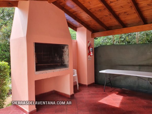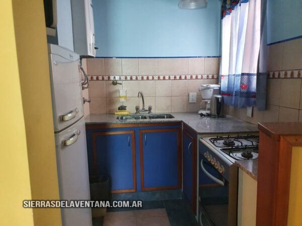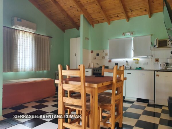 La cocina cuenta con jarra y cafetera eléctricas, microondas, vajilla completa, heladera con freezer, cocina de cuatro hornallas con horno. En el comedor hay mesa y sillas de madera y además un sommier del cual se saca una cama carrito. El baño es completo y tiene ducha, vanitory y secador de cabello. Se provee de ropa blanca y toallones para la pileta. En el comedor y el dormitorio hay TV led, ventilador de techo y calefacción de tiro balanceado. Posee parrilla propia y cochera para un auto.