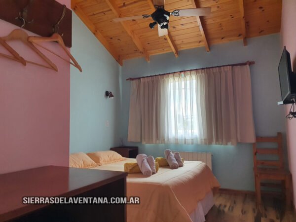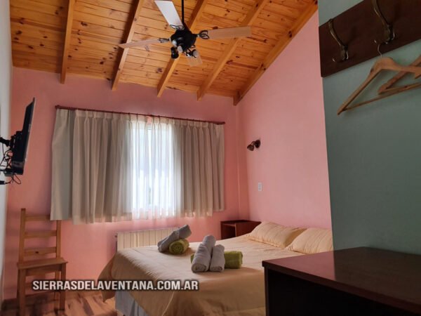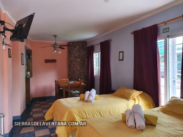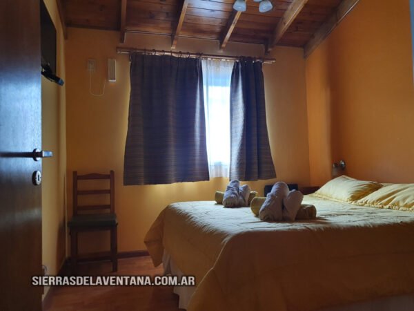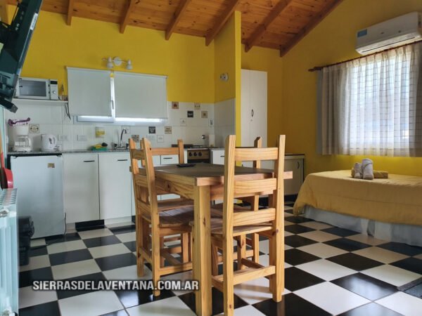 Apart en planta alta con vista a las sierras, totalmente equipado para cuatro personas. Tiene un dormitorio doble con cómoda, TV led, caja de seguridad y ventilador de techo. El ambiente comedor-cocina está equipado con jarra y cafetera eléctricas, microondas, vajilla completa, heladera bajomesada, cocina kitchenette de dos hornallas con horno mesa y sillas de madera. También cuenta con un sommier del cual se saca un carrocama de colchón bajo. En este star tenemos ventilador de techo y aire acondicionado. El baño es completo y tiene ducha, vanitory, tender térmico y secador de cabello. La calefacción es por caldera con radiadores. Se provee de ropa blanca y toallones para la pileta.