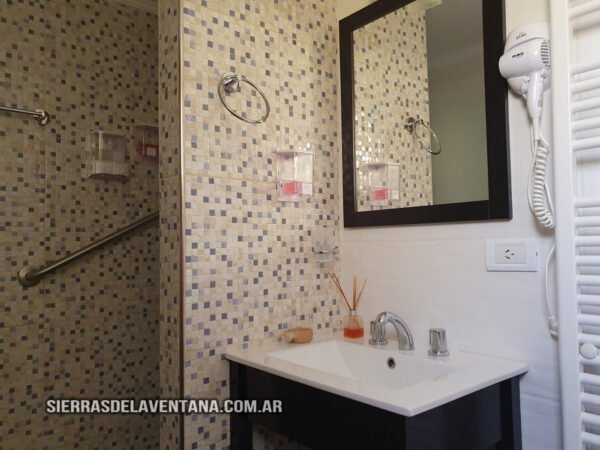 Apart en planta alta con vista a las sierras, totalmente equipado para cuatro personas. Tiene un dormitorio para dos personas con sommiers (puede armarse con cama doble o individuales), tiene cómoda, TV led, caja de seguridad y ventilador de techo. El ambiente comedor-cocina está equipado con jarra y cafetera eléctricas, microondas, vajilla completa, heladera bajomesada, cocina kitchenette de dos hornallas con horno, mesa y sillas de madera. También cuenta con un sommier del cual se saca un carrocama de colchón bajo. En este star tenemos ventilador de techo y aire acondicionado. El baño es completo y tiene ducha, vanitory, tender térmico y secador de cabello. La calefacción es por caldera con radiadores. Se provee de ropa blanca y toallones para la pileta. Hay TV led tanto en el comedor como en el dormitorio. Dispone de cochera para un auto y de una pequeña parrilla en planta baja.