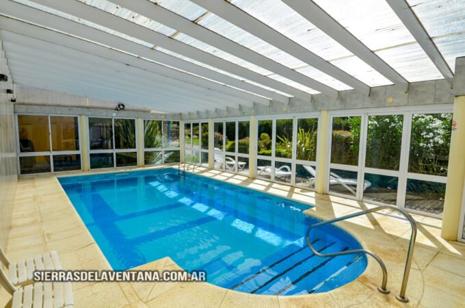 El predio cuenta con un sector de pileta totalmente cubierto que posee dos baños propios y deck exterior. La pileta, revestida interiormente con venecitas, posee un espejo de agua de unos 35 m3 y vereda de baldosones atérmicos-antideslizantes. En el sector de solarium se aprecian reposeras, mecitas, sillas, mesas con sombrilla y un banco.